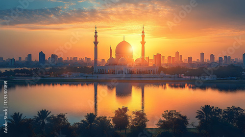 © realis, Naklejka premium Majestic sunset over a serene lake with a grand mosque silhouette, reflecting city skyline