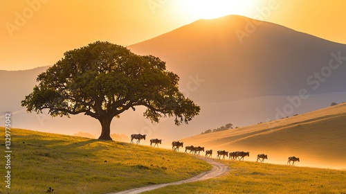 © Ganesha88, Obraz premium Majestic sunset over amboseli dusty trails with elephants nature landscape african wilderness