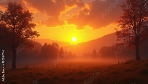 © Siwapong, Fototapeta premium Majestic Sunset over Misty Forest Landscape
