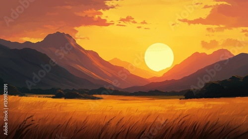 © warunthorn, Obraz premium Majestic Sunset over Mountain Landscape with Golden Fields