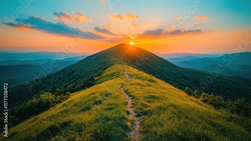 © AGUNG, Fototapeta premium Majestic sunset over mountain peak with grassy trail.