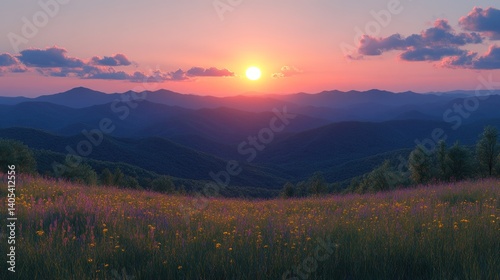 © atul _art, Obraz premium Majestic Sunset over Mountain Ranges and Wildflowers