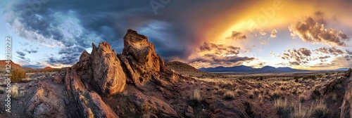 © BonzEarthsnapper, Naklejka premium Majestic Sunset Over Rocky Terrain with Dramatic Clouds Illuminating the Sky in a Breathtaking Desert Landscape