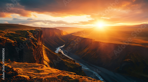 © Sayma Nasrin, Fototapeta premium Majestic sunset over rugged canyon landscape with winding river.