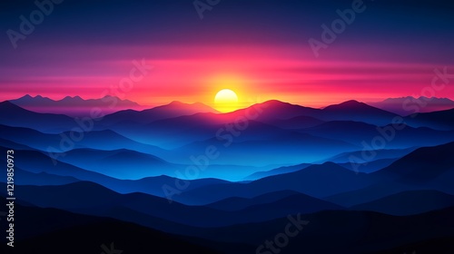Fototapeta premium Majestic Sunset Over Serene Blue Mountains: A Vibrant Landscape Painting