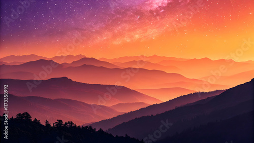 © Kanika Graphic, Fototapeta premium Majestic Sunset Over Serene Mountain Range with Starry Sky
