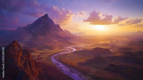 Fototapeta premium Majestic Sunset Over Serene Mountain Valley River Landscape