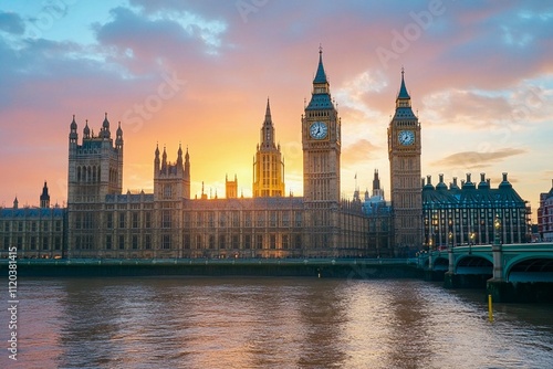 © Віталій Б., Naklejka premium Majestic sunset over the Houses of Parliament in London by the River Thames. Generative AI