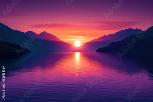 © Vibudhaart, Fototapeta premium Majestic sunset over tranquil lake nestled between vibrant purple mountains.