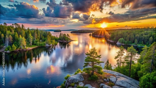 Naklejka premium Majestic sunset over tranquil lake waters surrounded by lush green forests and rugged shorelines in Voyageurs National Park, Minnesota.