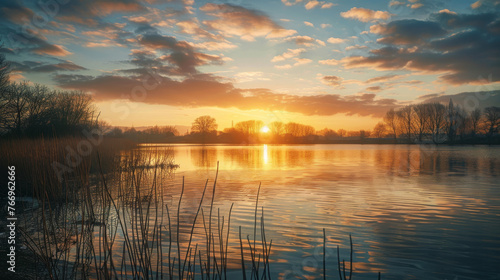 Obraz premium Majestic Sunset Over Tranquil Lake with Reflections and Reed Silhouettes