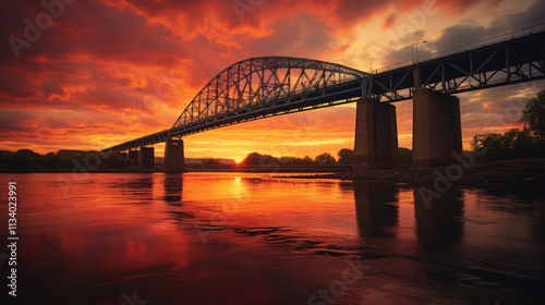 Naklejka premium Majestic Sunset Over Tranquil River Bridge