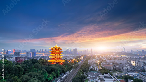 © zhouyilu, Fototapeta premium Majestic Sunset Over Urban Landscape Featuring Traditional Pavilion