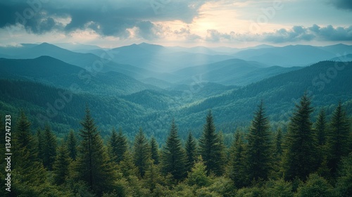 Fototapeta premium Majestic sunset over vast, layered mountain range with lush evergreen forest...