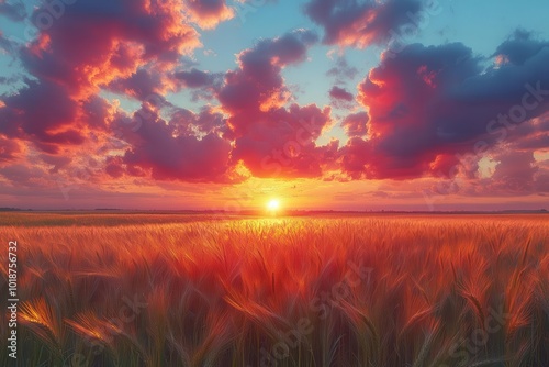 Fototapeta premium majestic sunset painting the sky over a serene field clouds rolling with...
