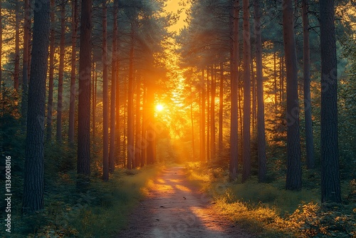 Obraz premium Majestic Sunset Path Through Pine Forest Golden Hour Nature Photography