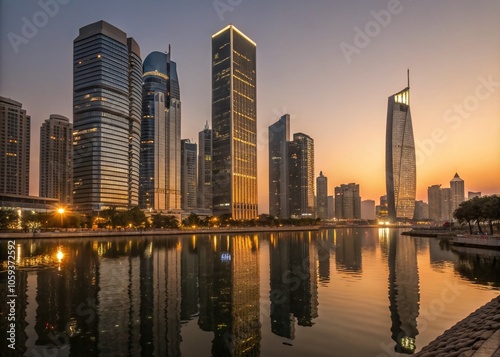 Fototapeta premium Majestic Sunset Reflection of Modern Skyscrapers in Urban Landscape
