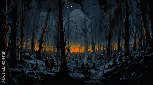 © Sam, Obraz premium Majestic Sunset Sky Over Snowy Forest Trees at Dusk