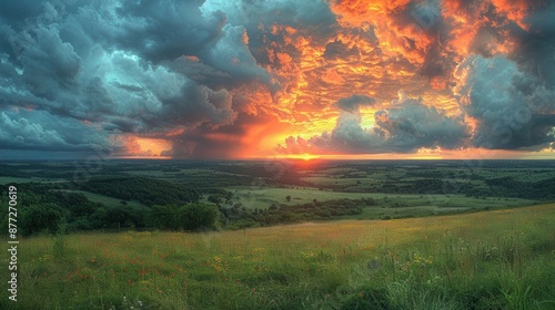 © frank29052515, Naklejka premium Majestic Sunset Sky with Dark Clouds Over Picturesque Countryside