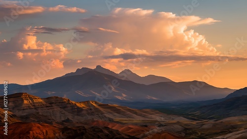 Naklejka premium Majestic Sunset Sky with Towering Clouds Over Rocky Landscape