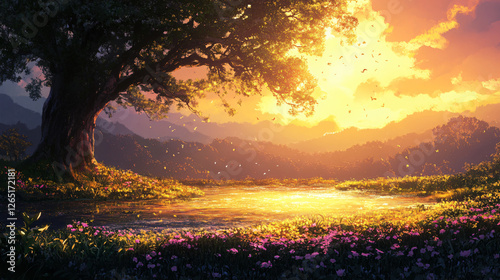Obraz premium Majestic sunset under ancient tree golden glowing sky breathtaking landscape...