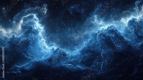 Obraz premium Majestic swirling clouds of deep blue and turquoise in the vast expanse of the night sky illuminated by distant stars