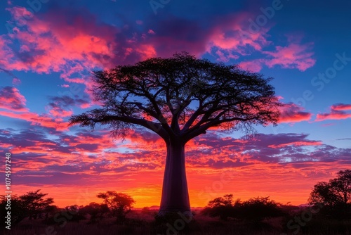 © Thi, Fototapeta premium Majestic tall baobab tree silhouetted against a vibrant African sunset landscape.