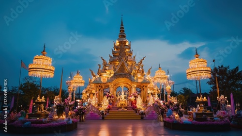 © Kullanat, Fototapeta premium Majestic Temple at Twilight with Golden Lights