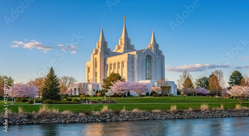 © KIMPOL, Fototapeta premium Majestic temple by a river, springtime