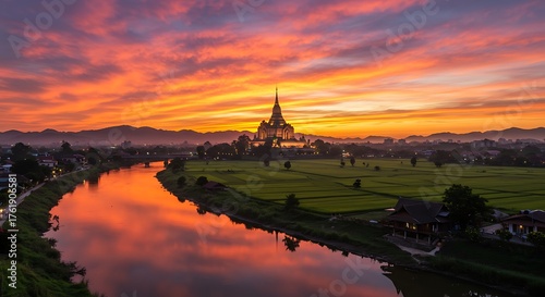 © Dilan, Obraz premium Majestic temple illuminated by vibrant sunrise over reflective riverside