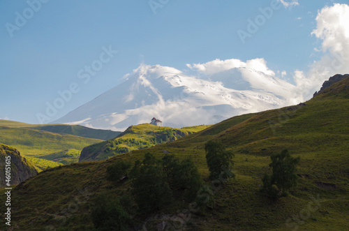 © Marisha_SL, Naklejka premium Majestic the two summits of the Mount Elbrus lit by sunset. View from camp on river Malka. Mount Elbrus - highest and most prominent peak in Russia and Europe. Russia, Caucasus, Kabardino-Balkaria