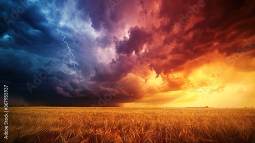 © Wp Background, Obraz premium Majestic Thunderstorm: Nature's Power Unleashed in Golden Wheat Field