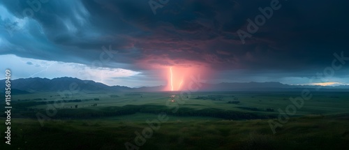 Naklejka premium Majestic Thunderstorm with Lightning Striking Over Green Landscape During...