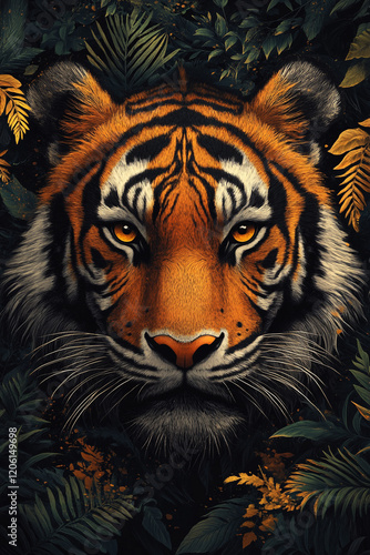 © Myartsam Design, Naklejka premium Majestic Tiger Amidst Lush Tropical Foliage