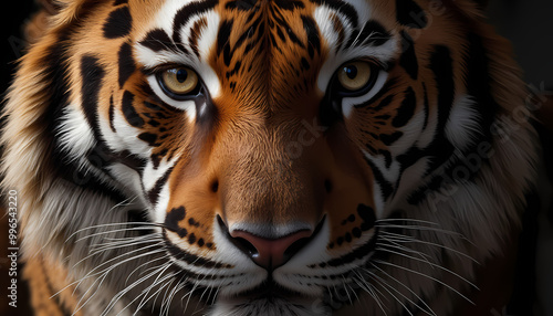 © Lyudmila Finkel, Obraz premium Majestic tiger face with intense gaze in dramatic close-up portrait