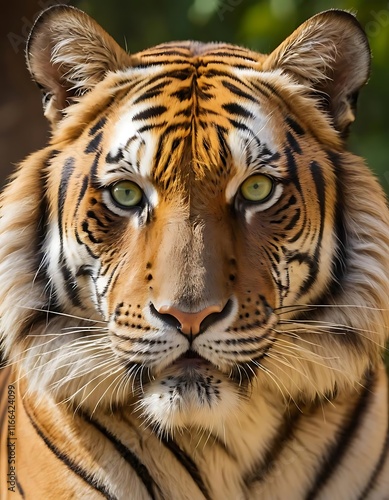 © Miracle Studio, Fototapeta premium Majestic Tiger Facing Forward in Sunlight. Beautiful Royal Bengal Tiger face close up