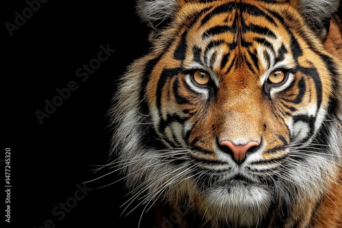 Fototapeta premium Majestic tiger gazes directly at the camera in a dark setting showcasing its...