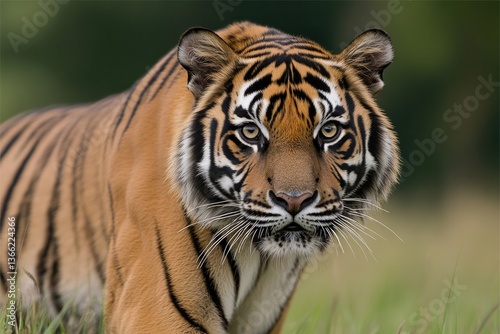 © Alexandr, Fototapeta premium Majestic tiger gazes intently, showcasing vibrant orange fur and