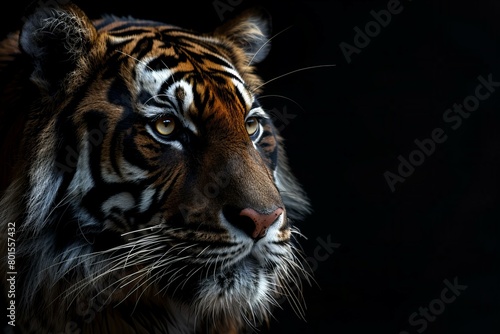 © Sandu, Fototapeta premium Majestic Tiger Portrait Against a Dark Black Background