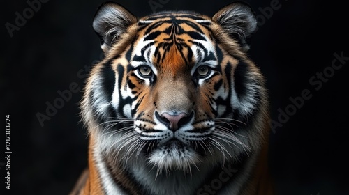 © mas, Fototapeta premium Majestic tiger portrait, dark background, zoo setting, wildlife conservation