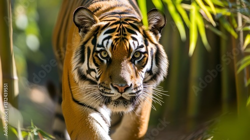 © chusnul, Obraz premium Majestic tiger prowling through lush bamboo forest, showcasing its striking features and power