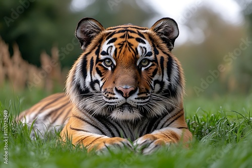 Fototapeta premium Majestic Tiger Resting in Lush Grass
