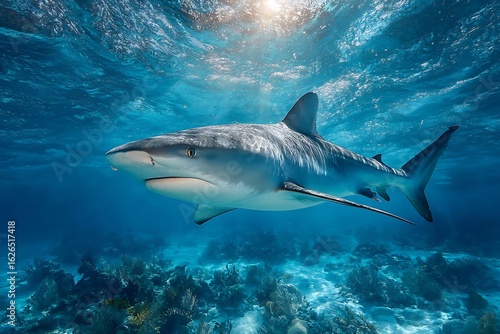 Obraz premium Majestic tiger shark swims in sunlit blue ocean water over coral