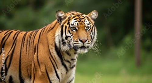 © Bara, Fototapeta premium Majestic Tiger Stares Intently in Lush Green Habitat.