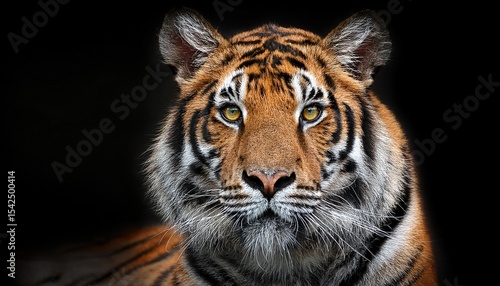 © Chloe, Fototapeta premium majestic tiger staring directly at the viewer exhibiting its striking orange and black striped fur against a dark background in a close up perspective