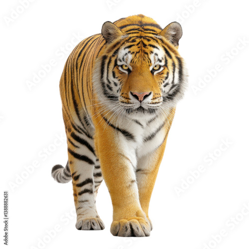 © Bismillah, Naklejka premium Majestic tiger walking forward, isolated on white. Powerful predator with orange and black stripes.