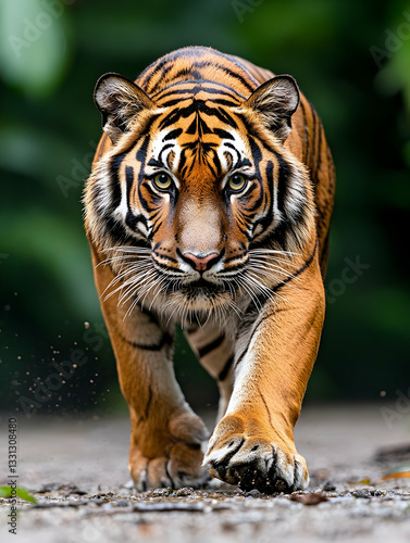 Fototapeta premium Majestic tiger walking towards camera, intense gaze, blurred background