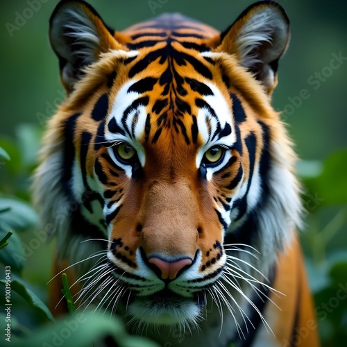Fototapeta premium Majestic tiger with intense gaze, its stripes clearly visible against a lush...