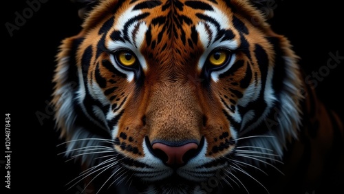 © AiPhotoSale, Naklejka premium Majestic tiger with piercing yellow eyes; its orange-black-white fur contrasts against a rich brown snout. Delicate white whiskers frame the captivating visage