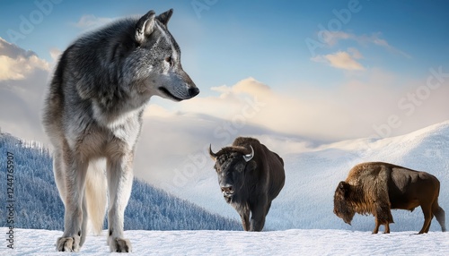 © netsay, Fototapeta premium Majestic Timber Wolf and Buffalo Overseeing a SnowCovered Landscape A Vigilant Pair in a Frosty Wilderness at Dusk on January,